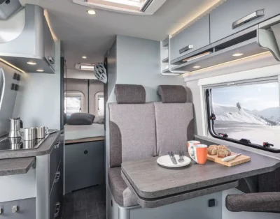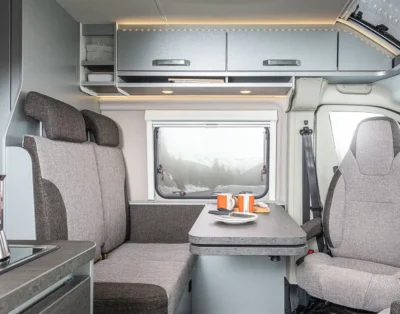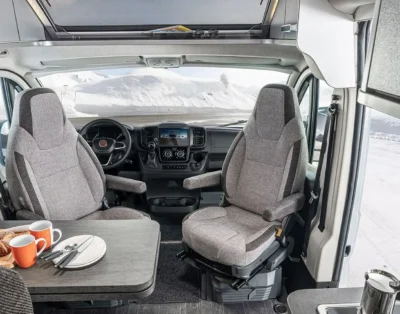 It is 160hp factory tuned and has a 6 speed gearbox. Furthermore, the camper has a built-in navigation system with reversing camera, airbags, cruise control, electrically operated windows, electrically operated mirrors, heated door mirrors, power steering and an electrically extendable step. The camper has a Truma heater with ring heating and a separate heater on electricity. There is a motor air conditioning system in the sitting cabin and a fixed air conditioning system above the sleeping area.